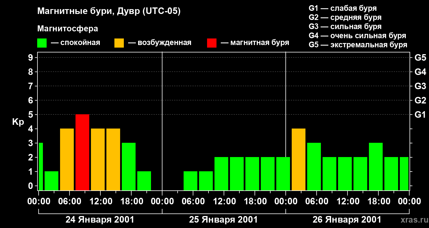 Изменения геомагнитного индекса Kp с 24 по 26 января 2001 года для средних широт