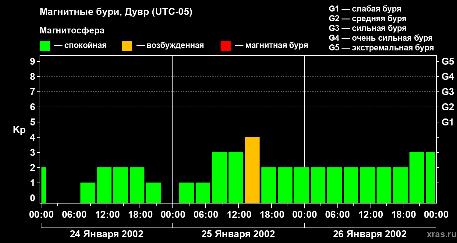Изменения геомагнитного индекса Kp с 24 по 26 января 2002 года для средних широт
