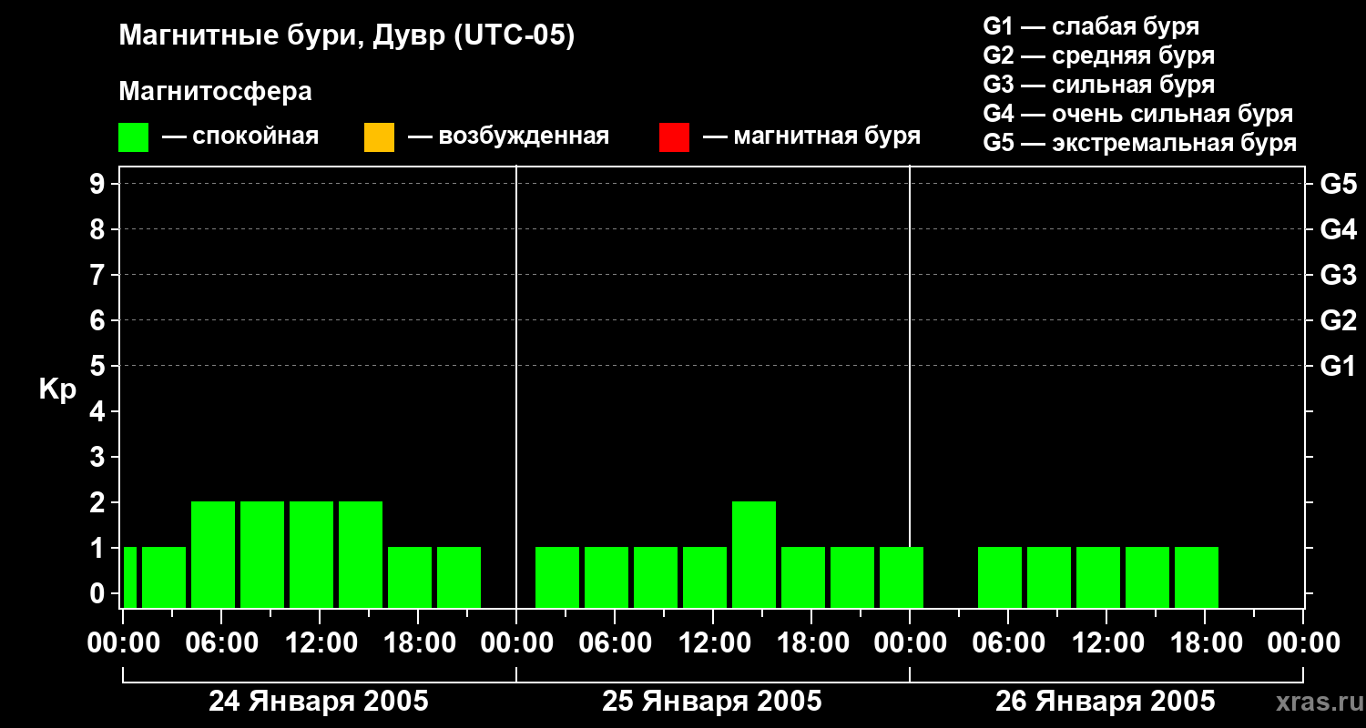 Изменения геомагнитного индекса Kp с 24 по 26 января 2005 года для средних широт