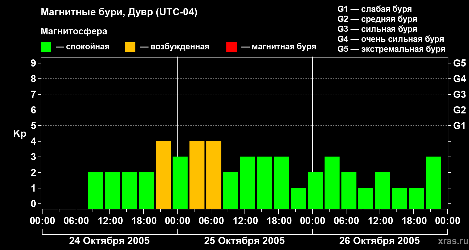 Изменения геомагнитного индекса Kp с 24 по 26 октября 2005 года для средних широт