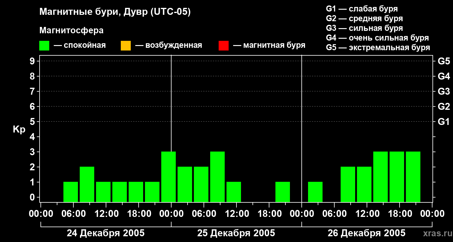 Изменения геомагнитного индекса Kp с 24 по 26 декабря 2005 года для средних широт