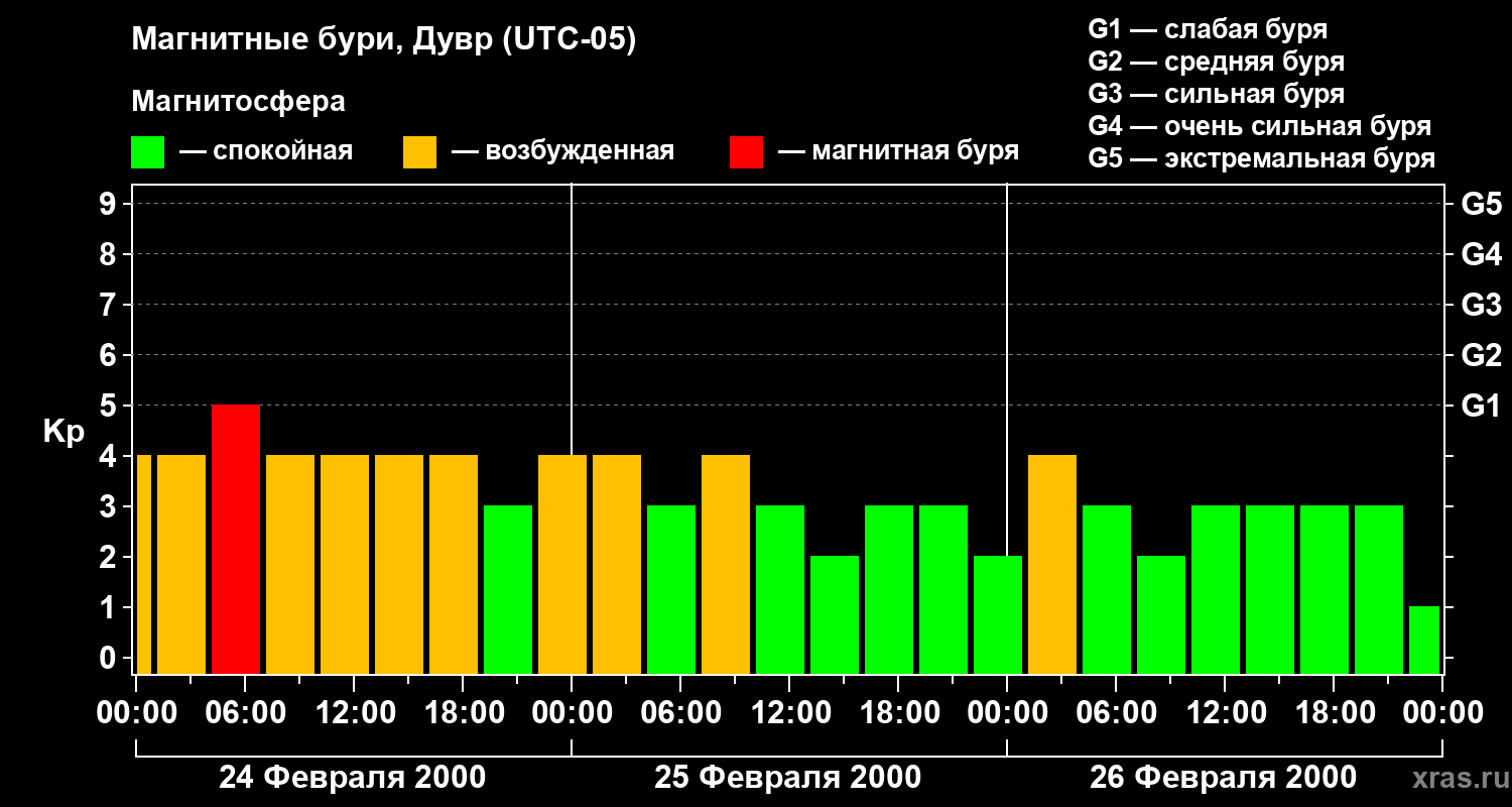 Изменения геомагнитного индекса Kp с 24 по 26 февраля 2000 года для средних широт