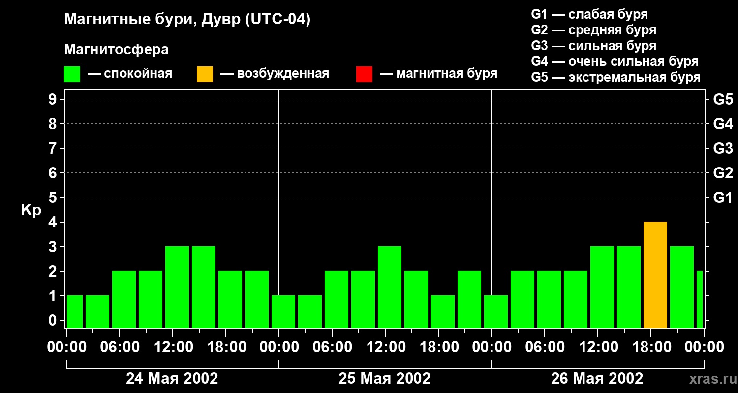Изменения геомагнитного индекса Kp с 24 по 26 мая 2002 года для средних широт