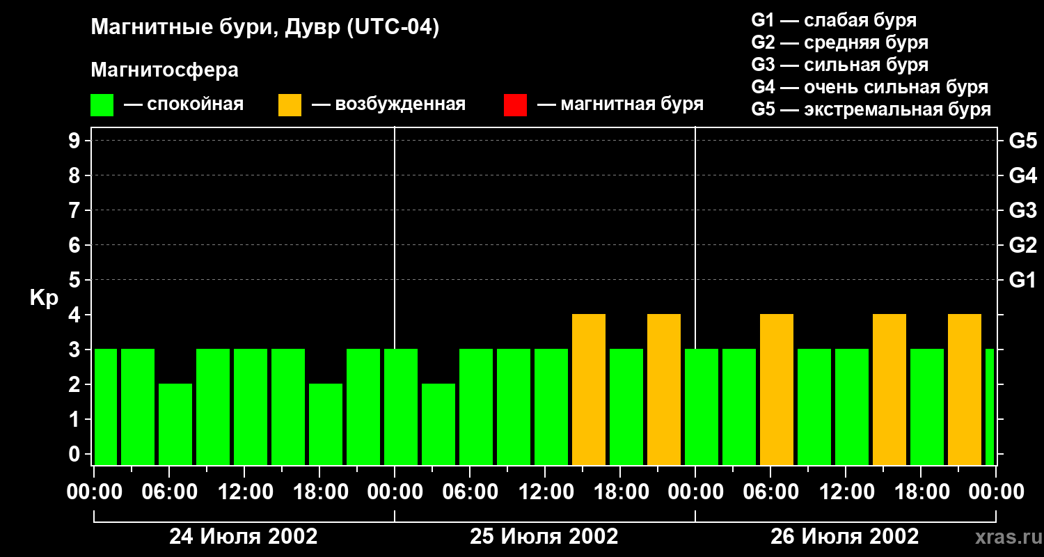 Изменения геомагнитного индекса Kp с 24 по 26 июля 2002 года для средних широт