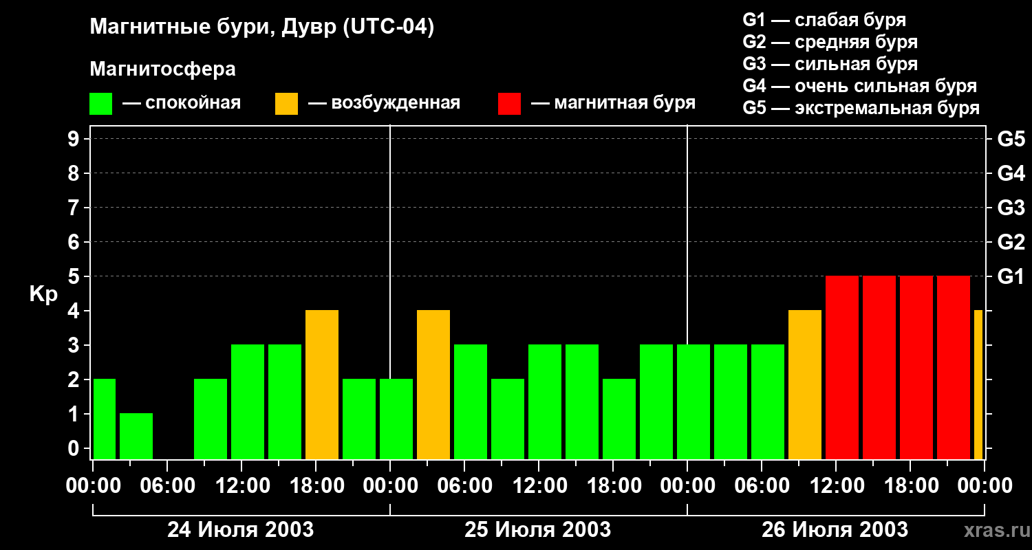 Изменения геомагнитного индекса Kp с 24 по 26 июля 2003 года для средних широт