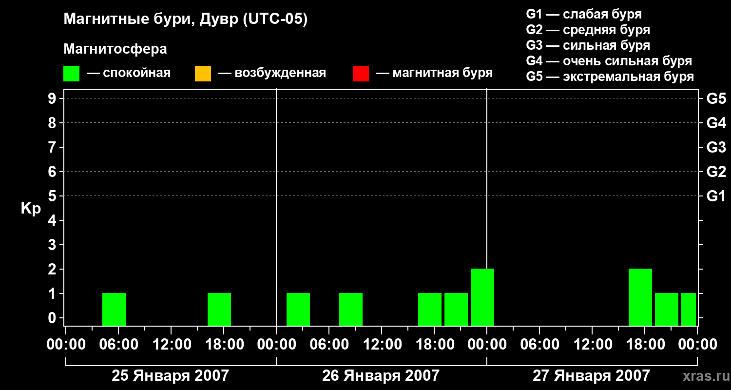 Изменения геомагнитного индекса Kp с 25 по 27 января 2007 года для средних широт
