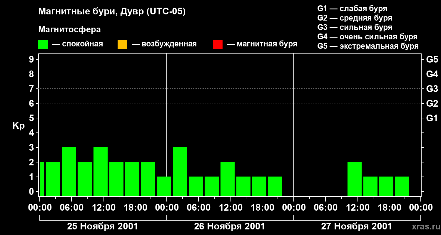 Изменения геомагнитного индекса Kp с 25 по 27 ноября 2001 года для средних широт
