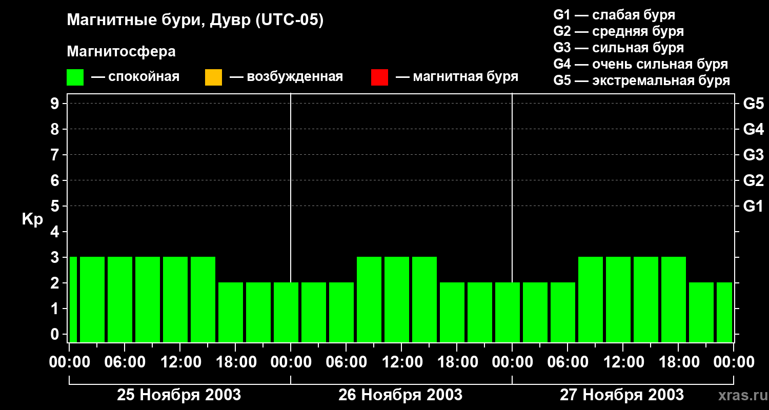 Изменения геомагнитного индекса Kp с 25 по 27 ноября 2003 года для средних широт