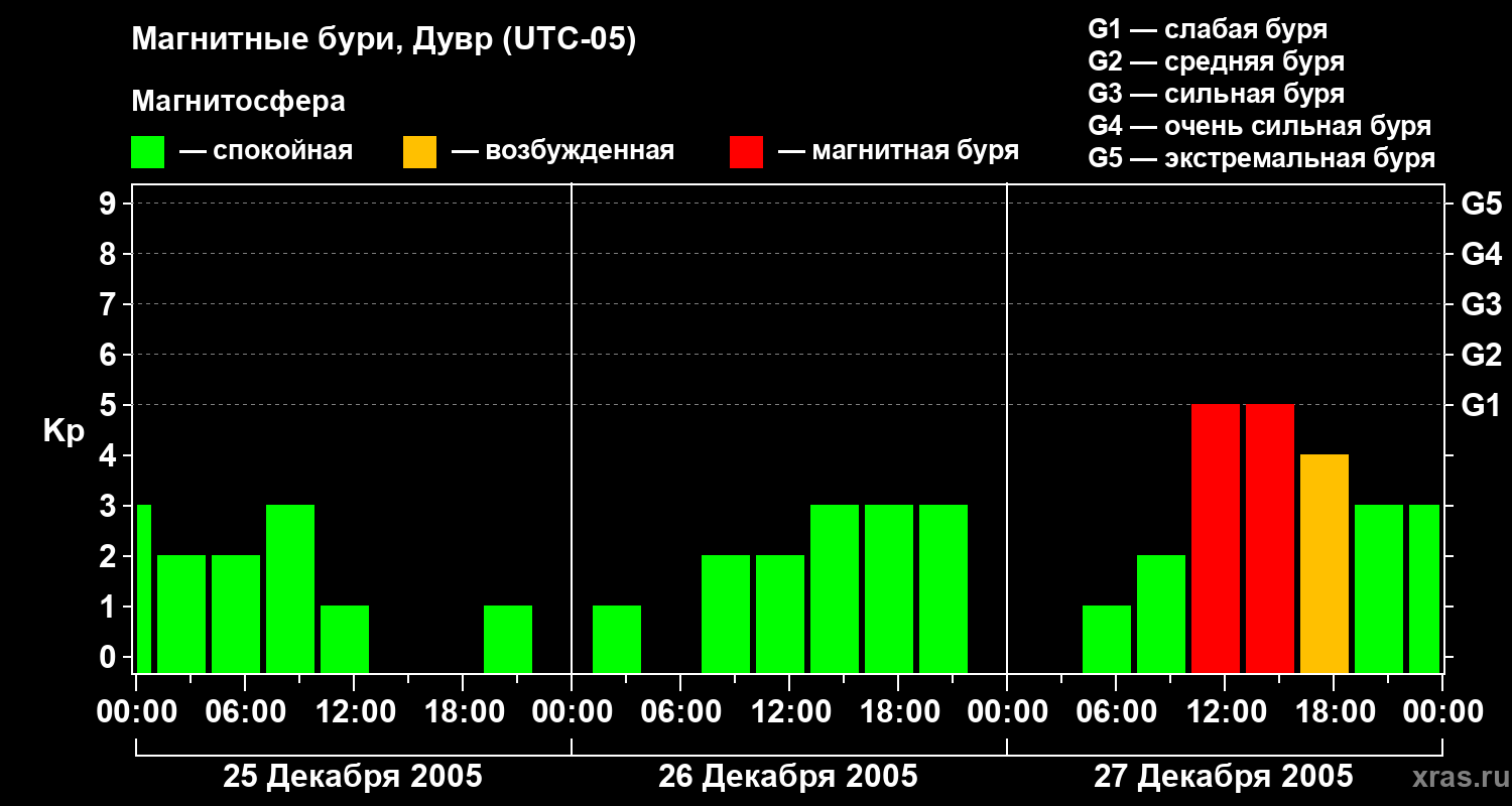 Изменения геомагнитного индекса Kp с 25 по 27 декабря 2005 года для средних широт
