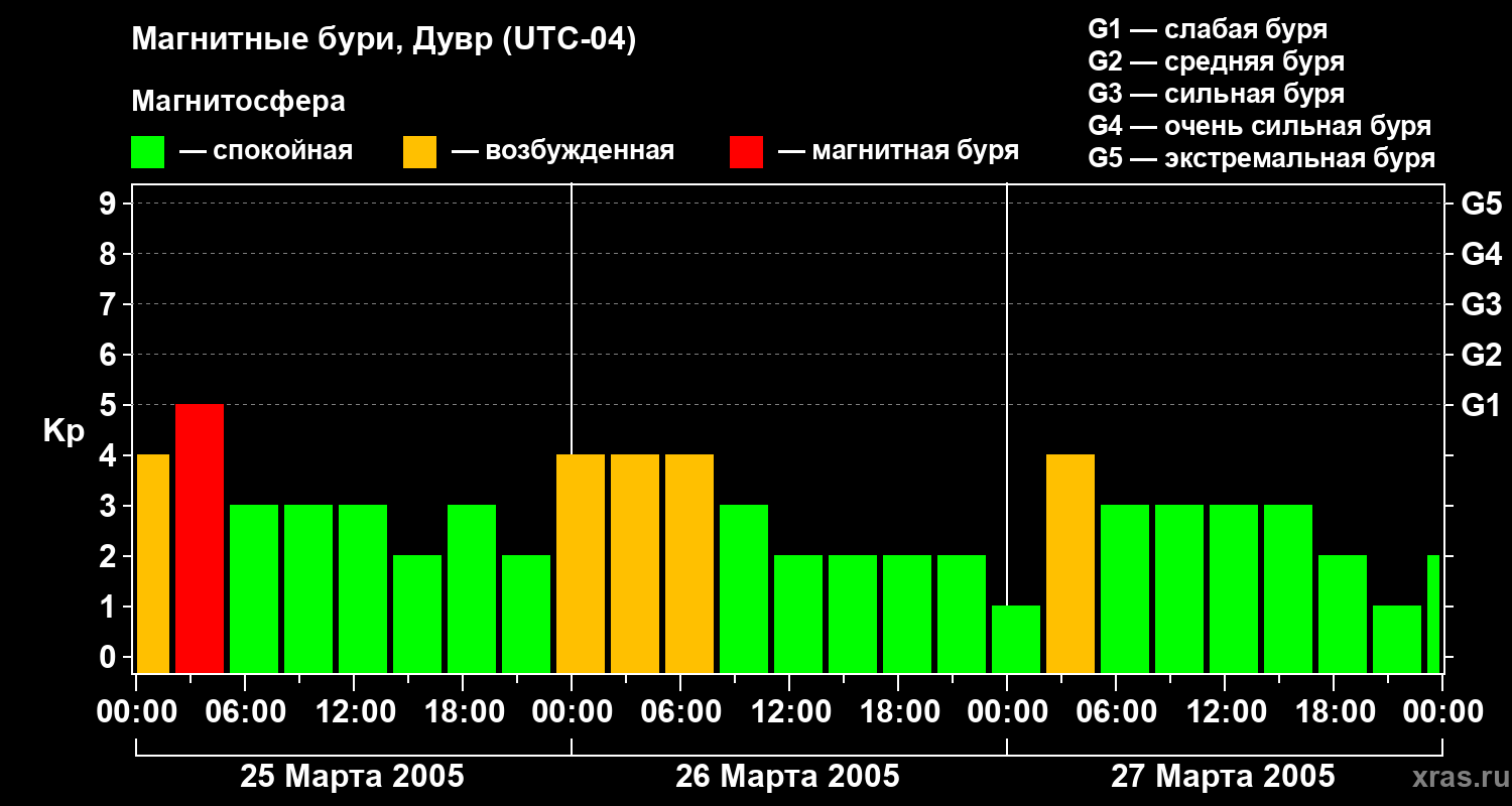 Изменения геомагнитного индекса Kp с 25 по 27 марта 2005 года для средних широт