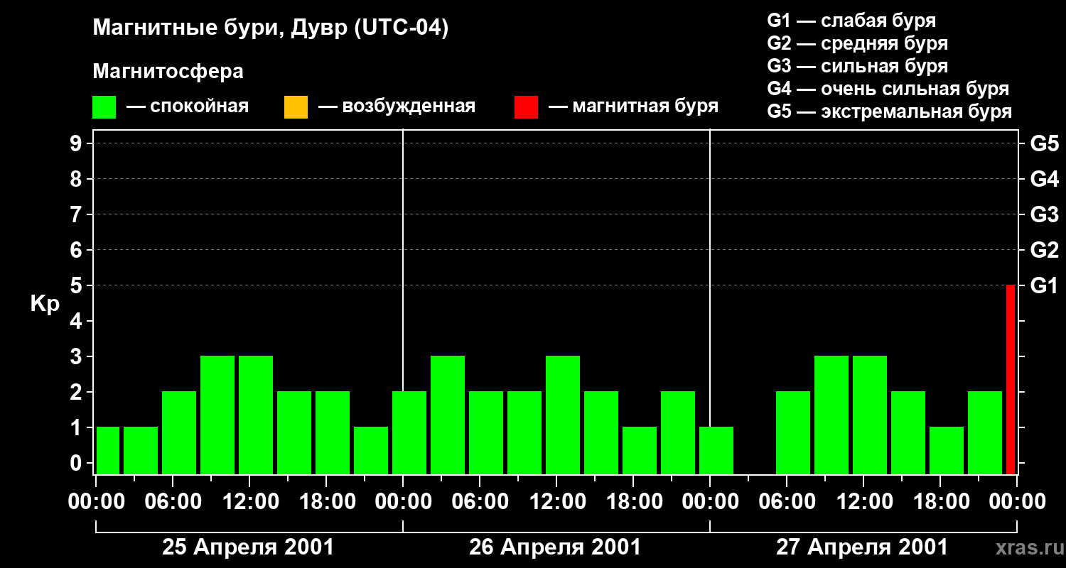 Изменения геомагнитного индекса Kp с 25 по 27 апреля 2001 года для средних широт