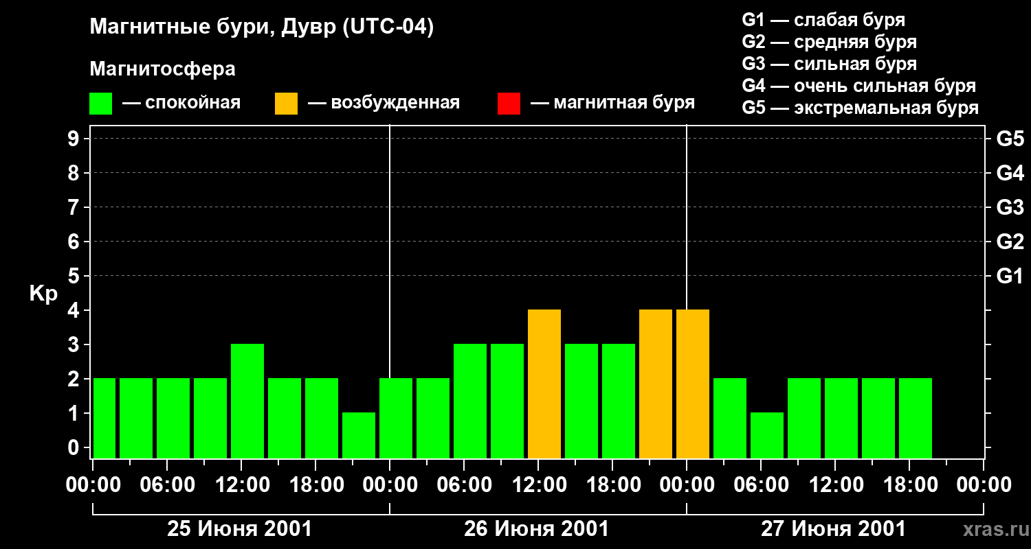 Изменения геомагнитного индекса Kp с 25 по 27 июня 2001 года для средних широт