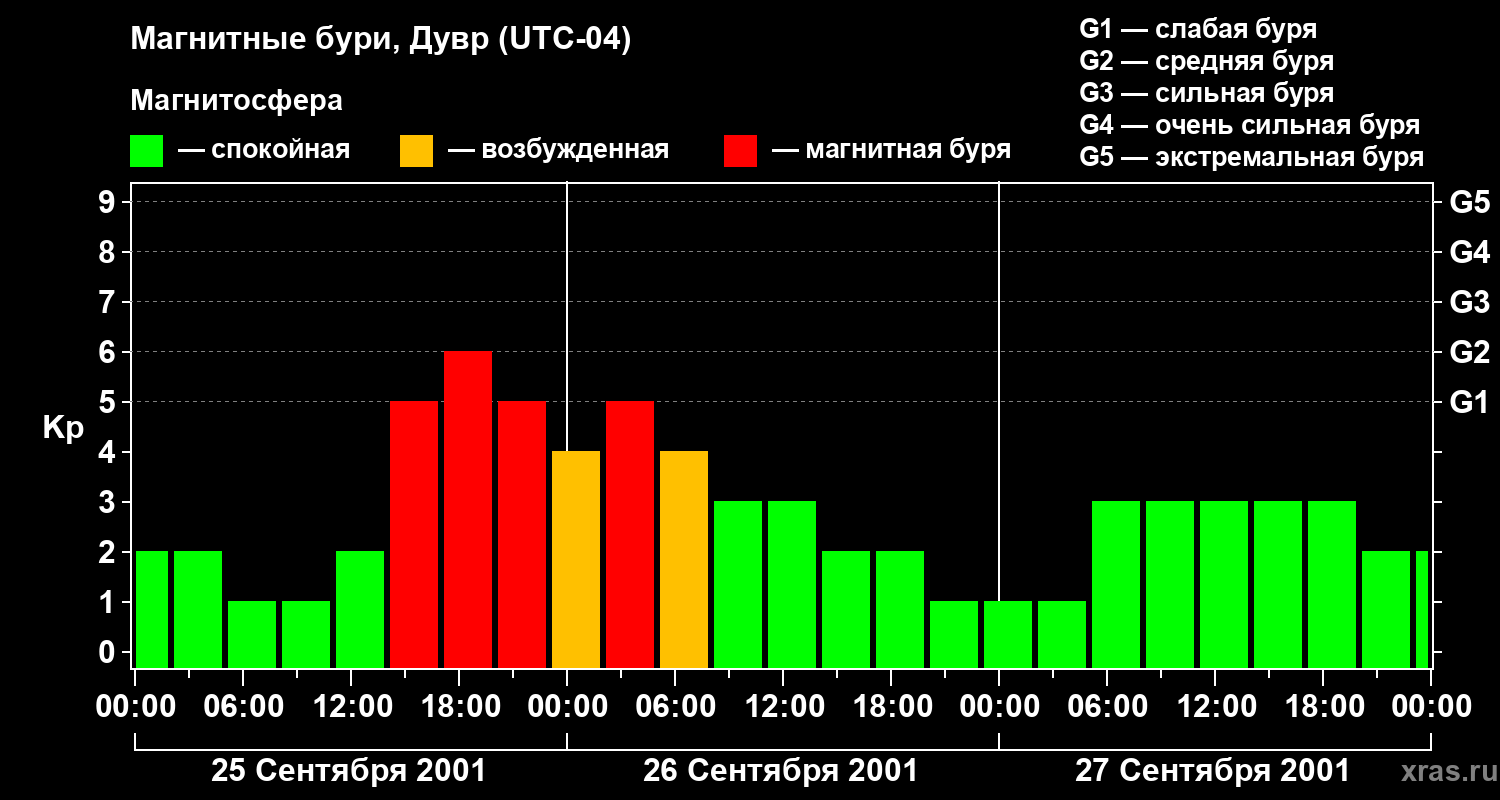 Изменения геомагнитного индекса Kp с 25 по 27 сентября 2001 года для средних широт