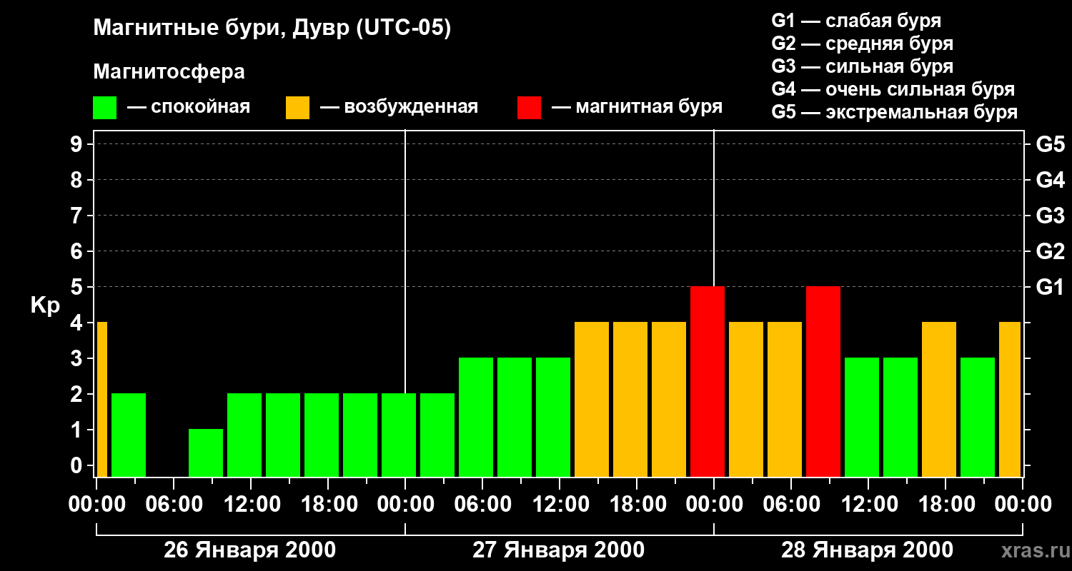 Изменения геомагнитного индекса Kp с 26 по 28 января 2000 года для средних широт