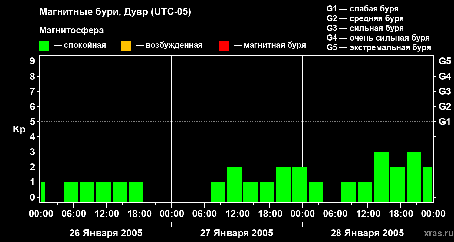 Изменения геомагнитного индекса Kp с 26 по 28 января 2005 года для средних широт