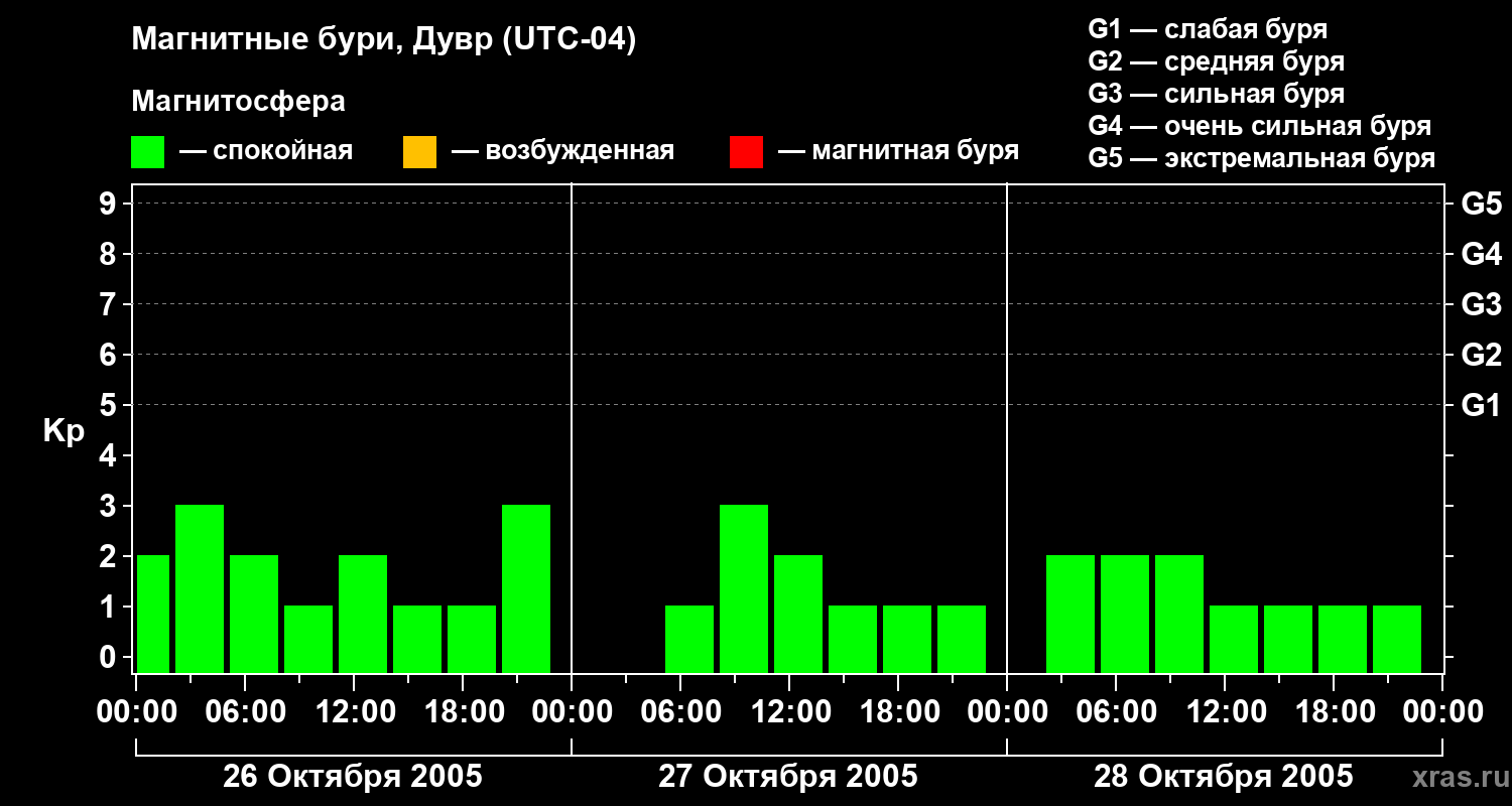 Изменения геомагнитного индекса Kp с 26 по 28 октября 2005 года для средних широт