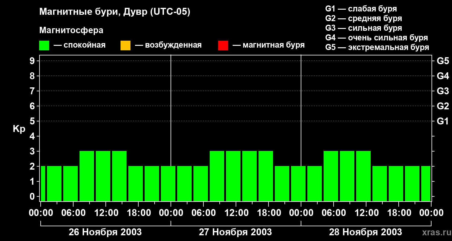 Изменения геомагнитного индекса Kp с 26 по 28 ноября 2003 года для средних широт