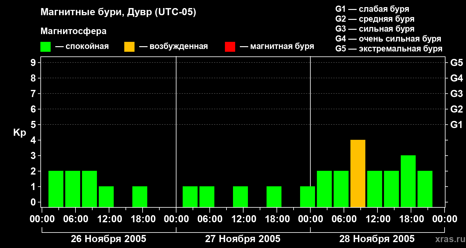 Изменения геомагнитного индекса Kp с 26 по 28 ноября 2005 года для средних широт