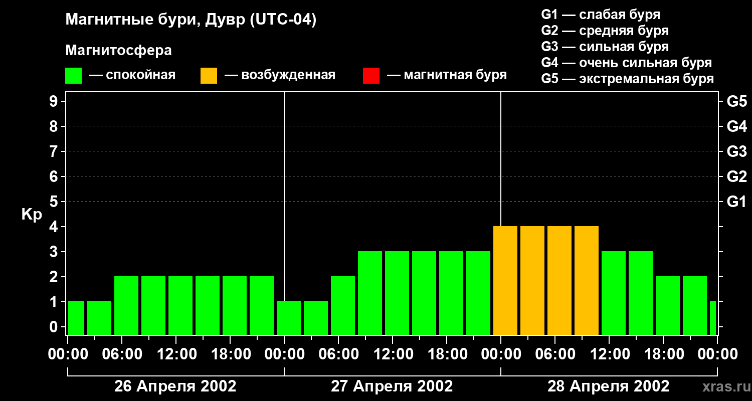 Изменения геомагнитного индекса Kp с 26 по 28 апреля 2002 года для средних широт