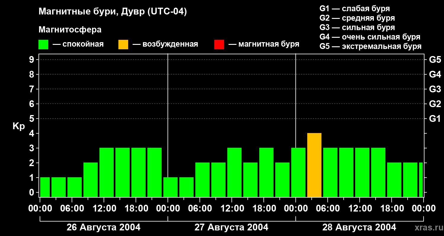 Изменения геомагнитного индекса Kp с 26 по 28 августа 2004 года для средних широт