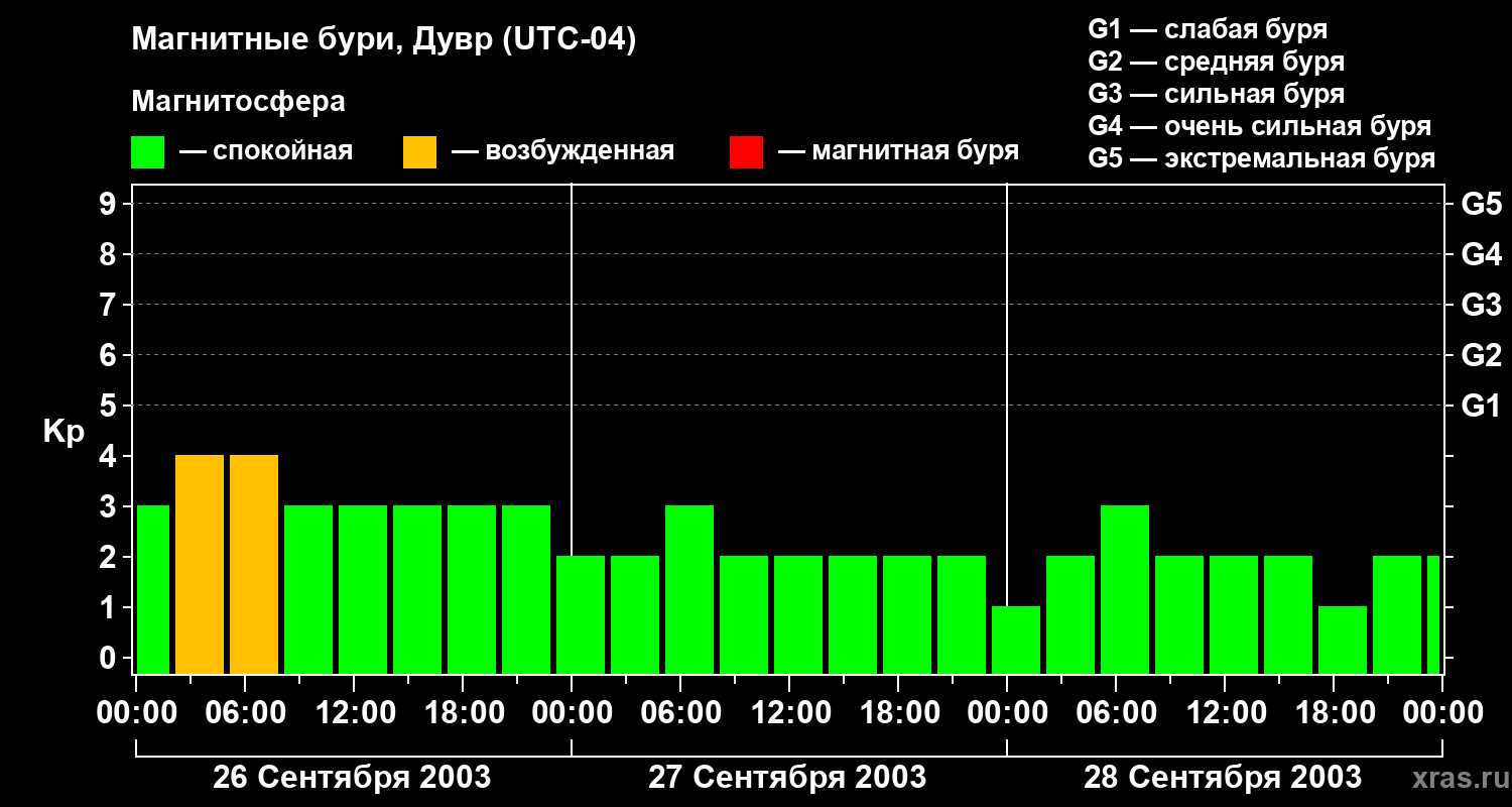Изменения геомагнитного индекса Kp с 26 по 28 сентября 2003 года для средних широт