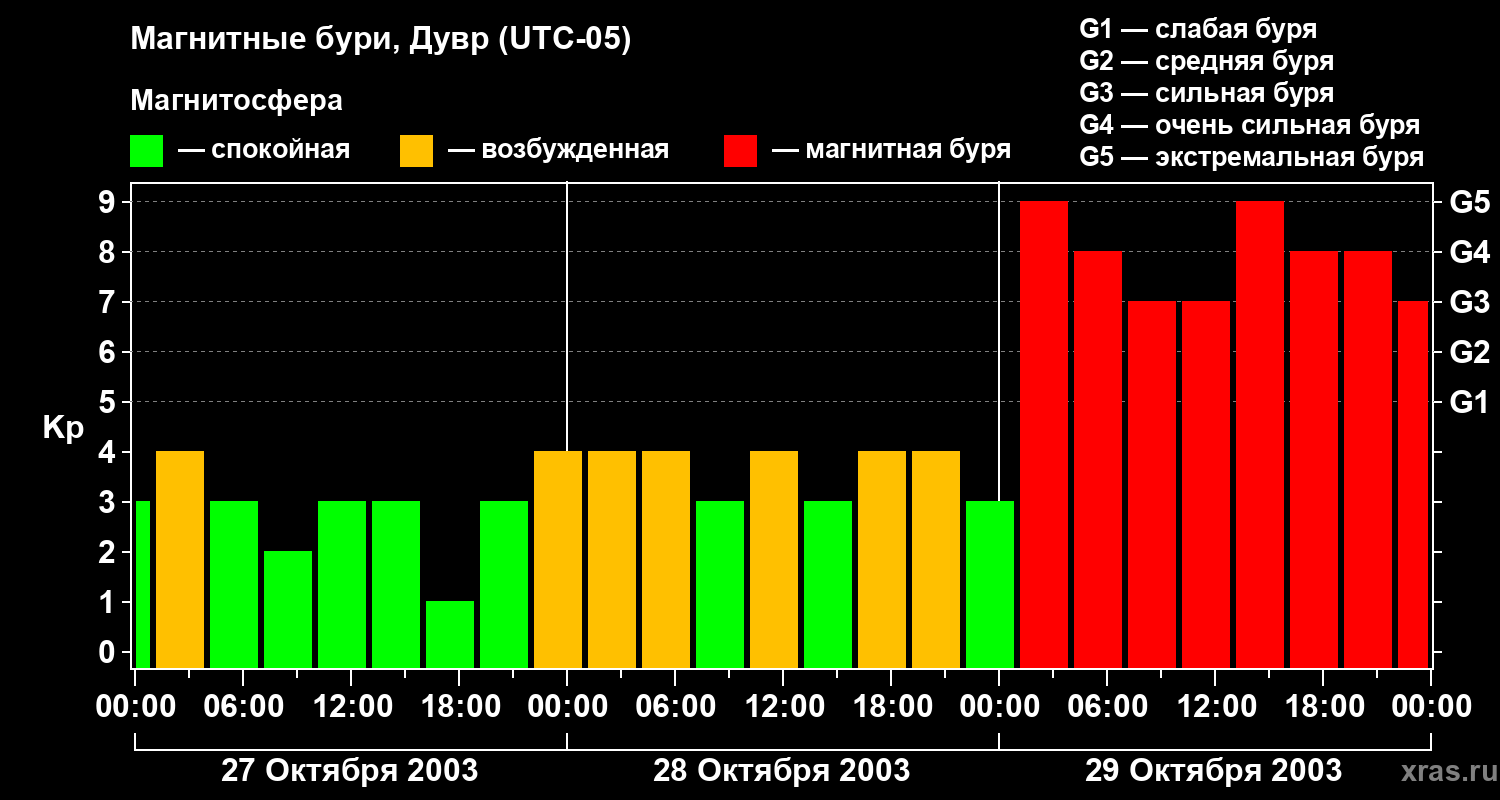 Изменения геомагнитного индекса Kp с 27 по 29 октября 2003 года для средних широт