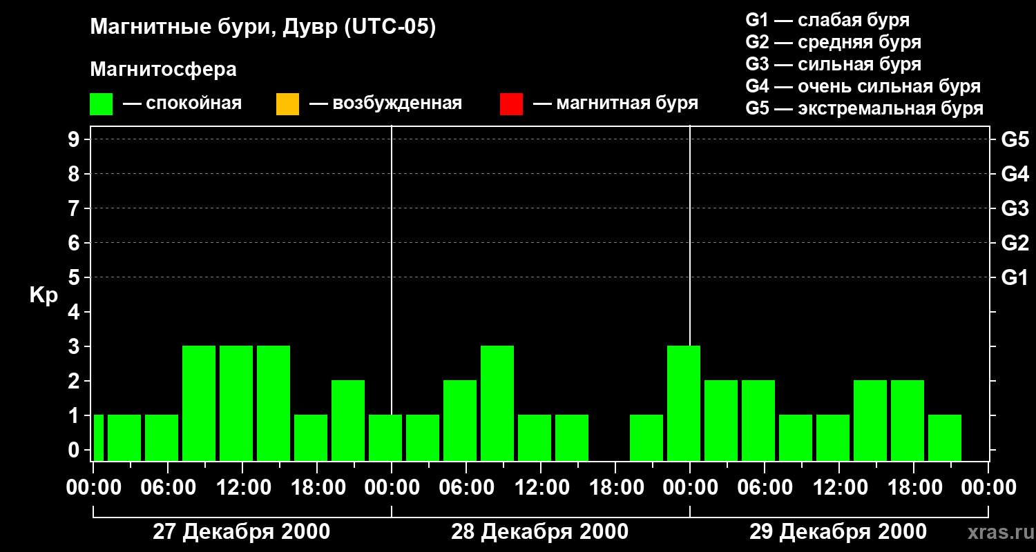Изменения геомагнитного индекса Kp с 27 по 29 декабря 2000 года для средних широт