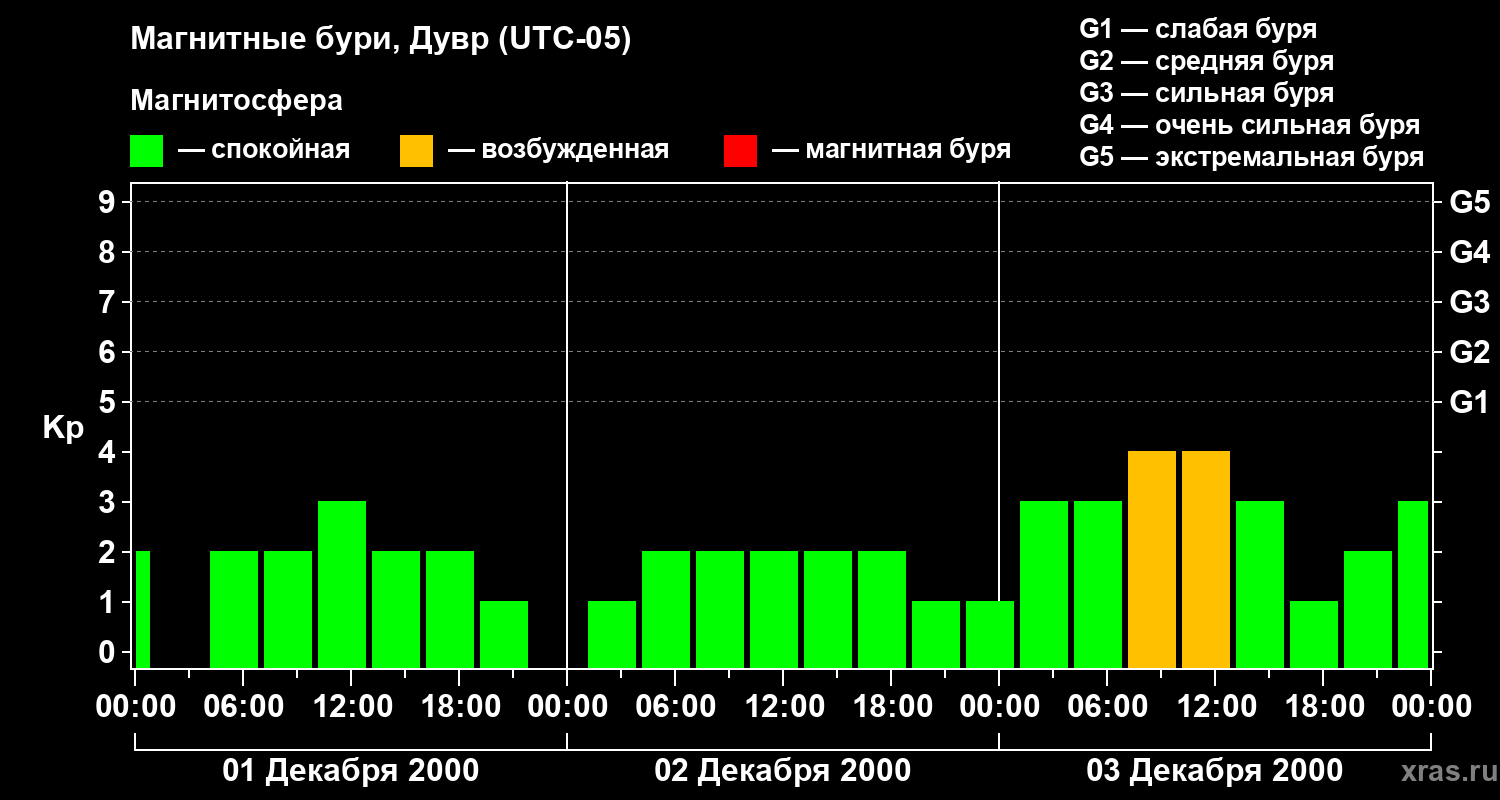 Изменения геомагнитного индекса Kp с 1 по 3 декабря 2000 года для средних широт