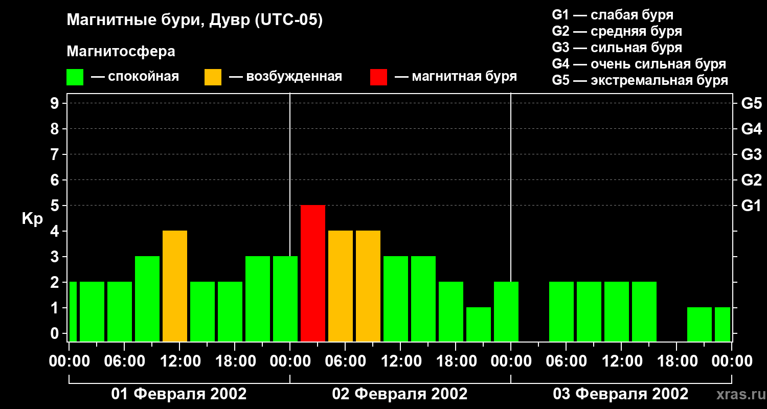 Изменения геомагнитного индекса Kp с 1 по 3 февраля 2002 года для средних широт