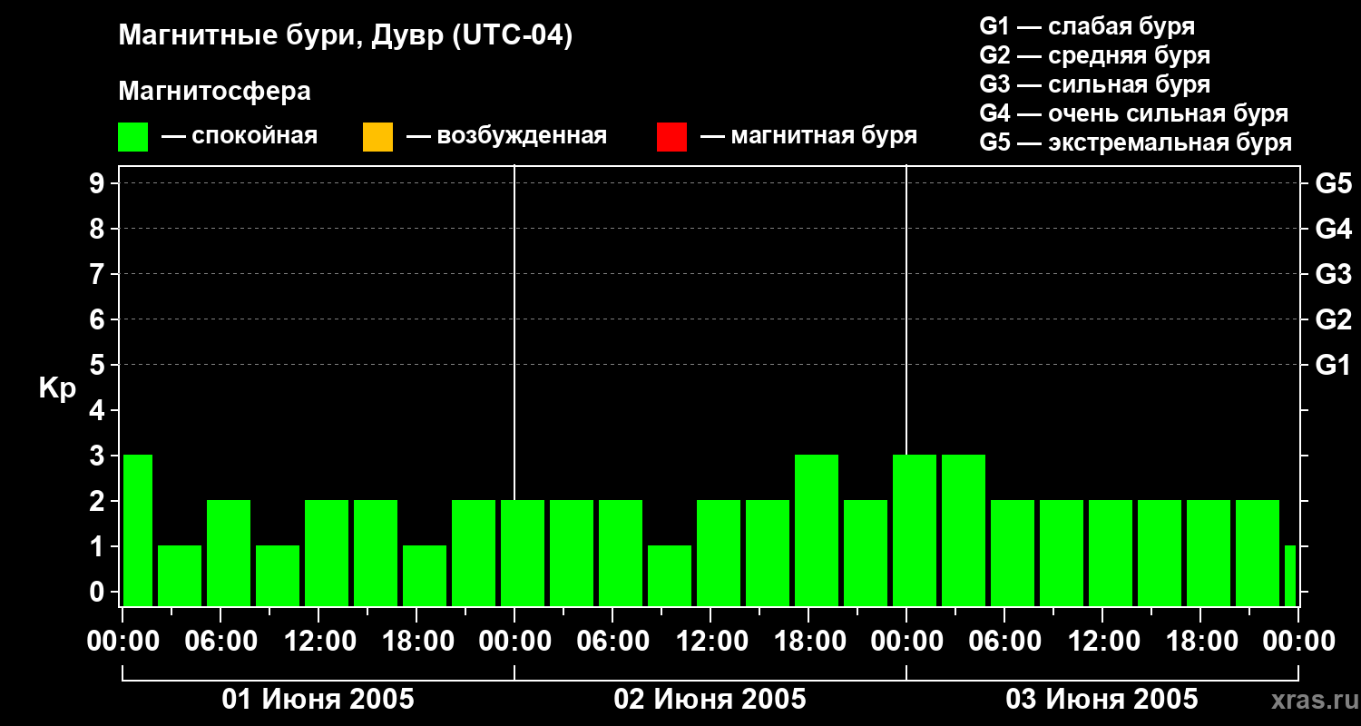 Изменения геомагнитного индекса Kp с 1 по 3 июня 2005 года для средних широт