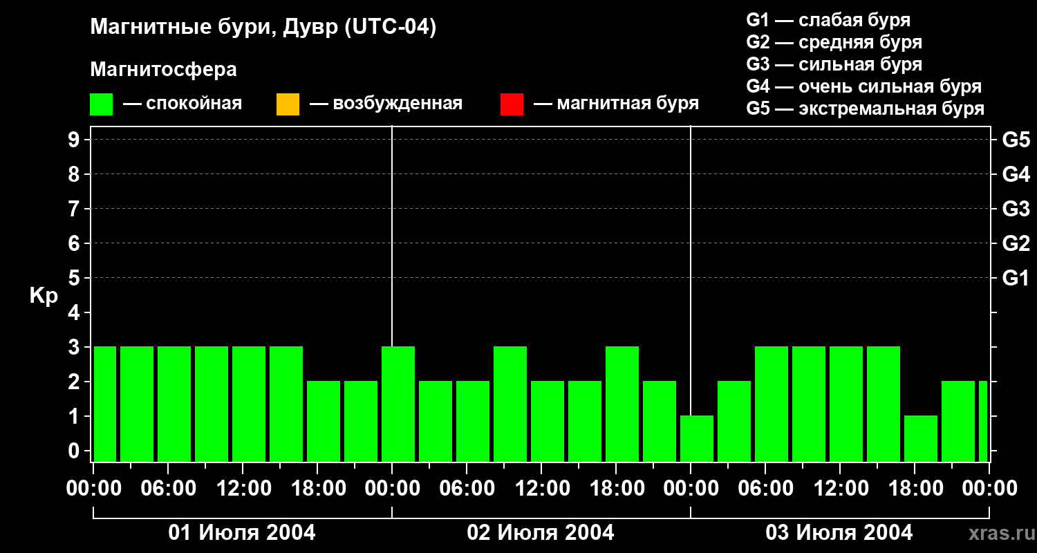 Изменения геомагнитного индекса Kp с 1 по 3 июля 2004 года для средних широт