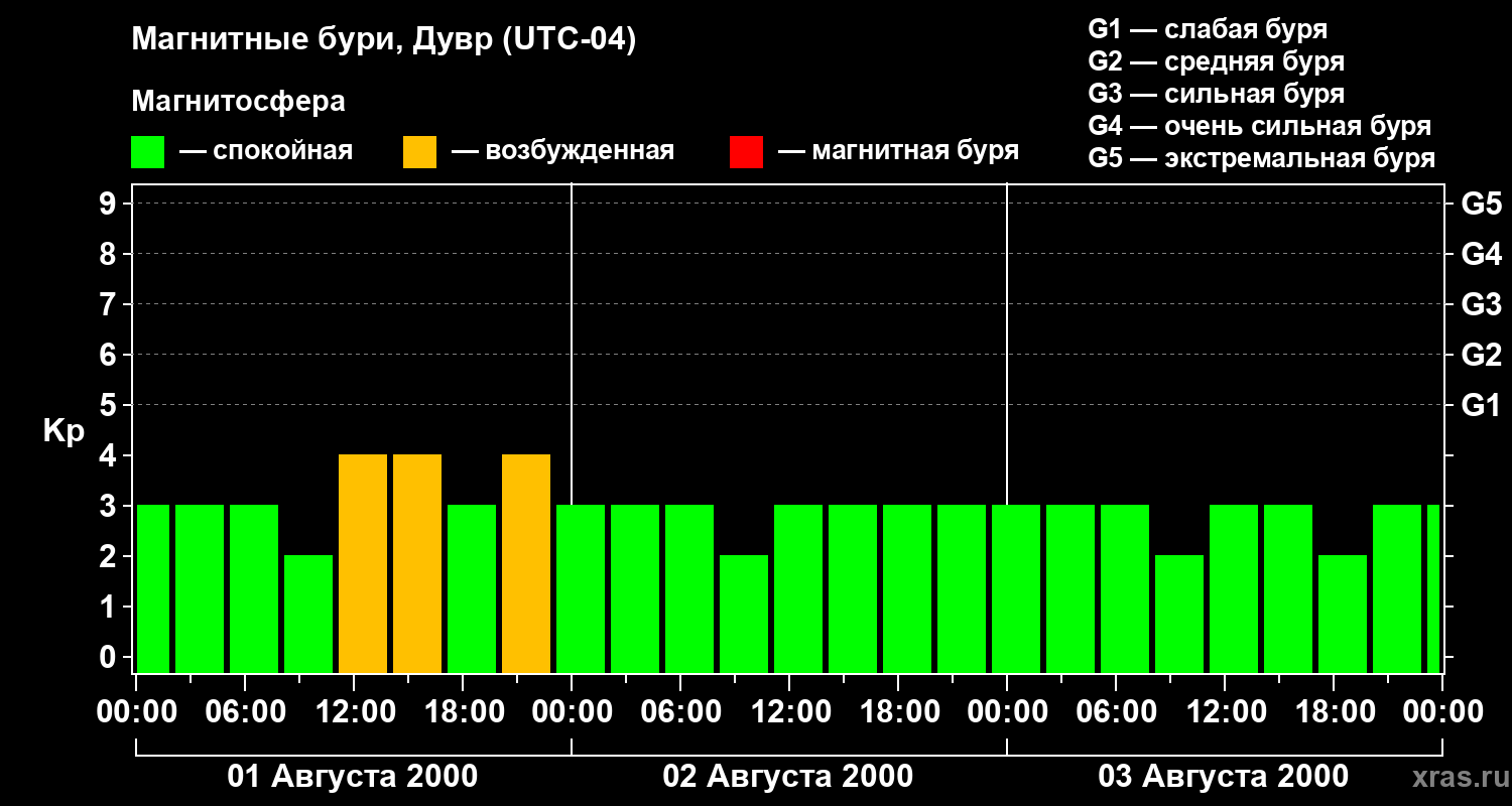 Изменения геомагнитного индекса Kp с 1 по 3 августа 2000 года для средних широт