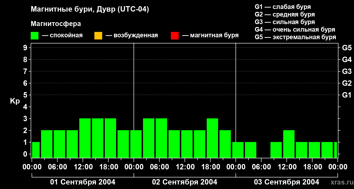 Изменения геомагнитного индекса Kp с 1 по 3 сентября 2004 года для средних широт