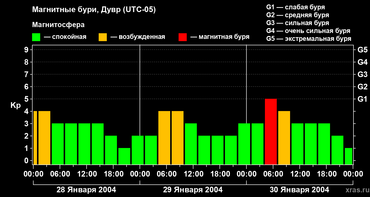 Изменения геомагнитного индекса Kp с 28 по 30 января 2004 года для средних широт