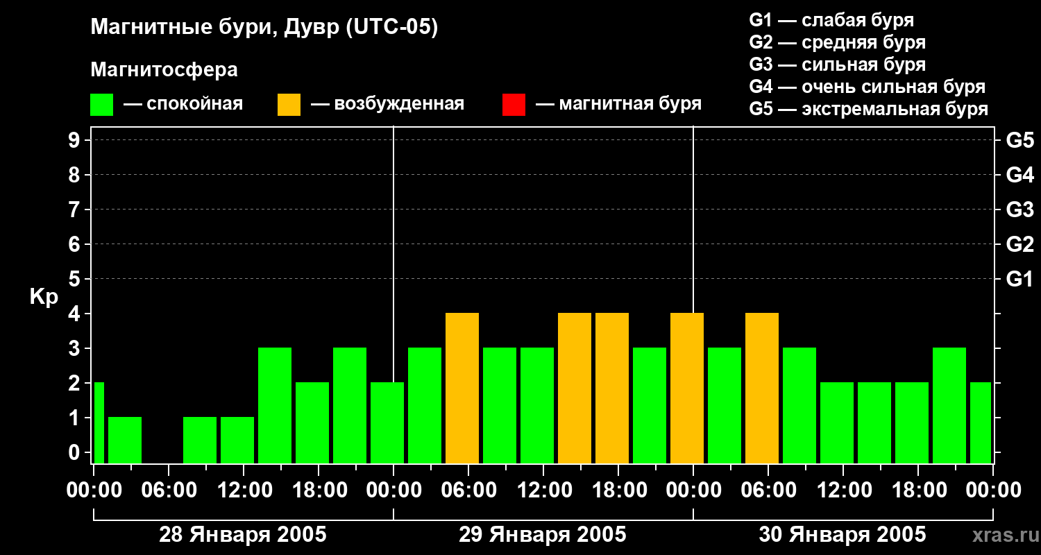 Изменения геомагнитного индекса Kp с 28 по 30 января 2005 года для средних широт