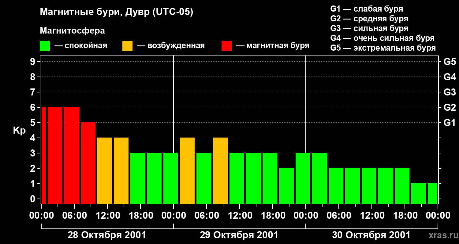 Изменения геомагнитного индекса Kp с 28 по 30 октября 2001 года для средних широт