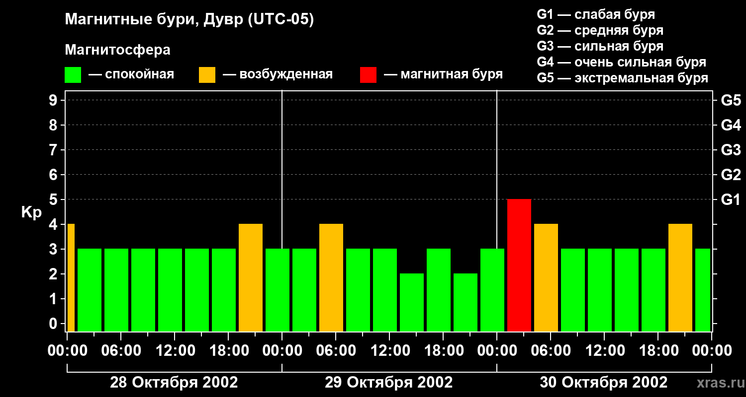 Изменения геомагнитного индекса Kp с 28 по 30 октября 2002 года для средних широт