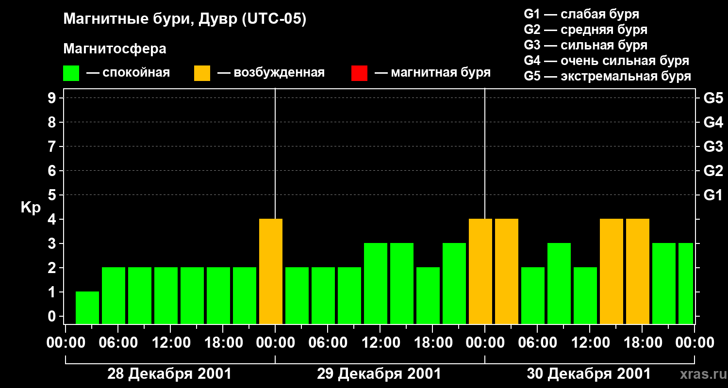 Изменения геомагнитного индекса Kp с 28 по 30 декабря 2001 года для средних широт