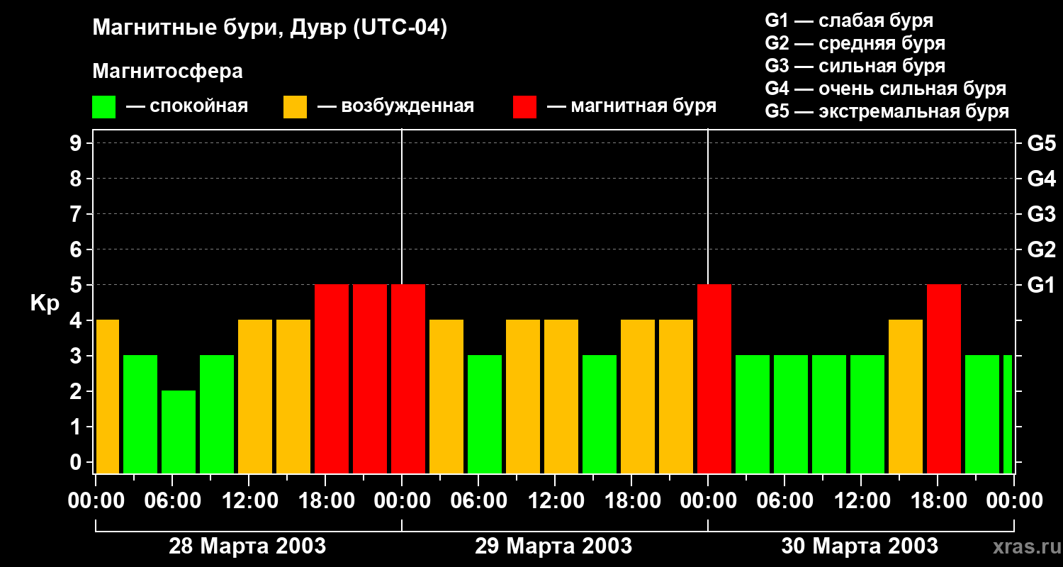 Изменения геомагнитного индекса Kp с 28 по 30 марта 2003 года для средних широт