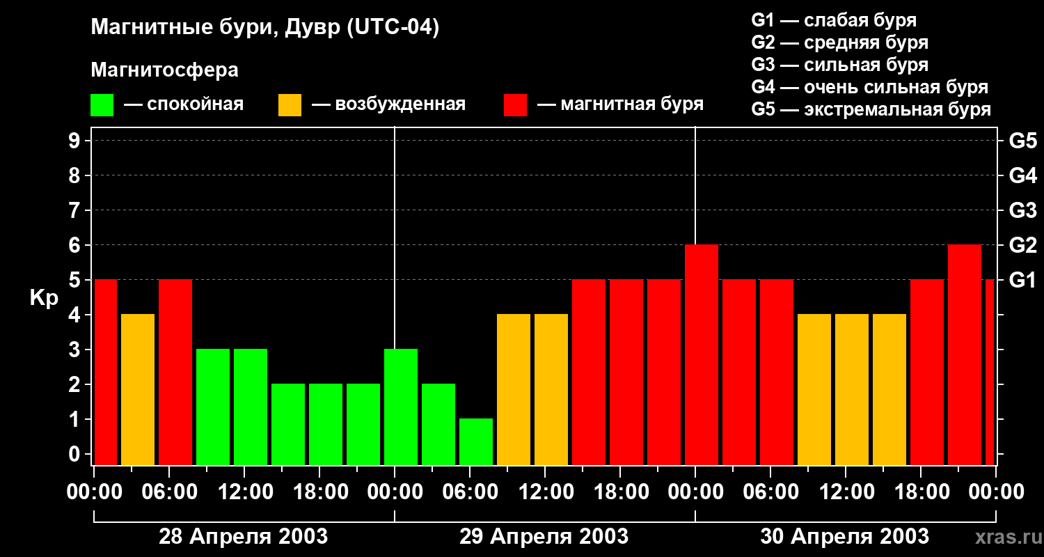 Изменения геомагнитного индекса Kp с 28 по 30 апреля 2003 года для средних широт
