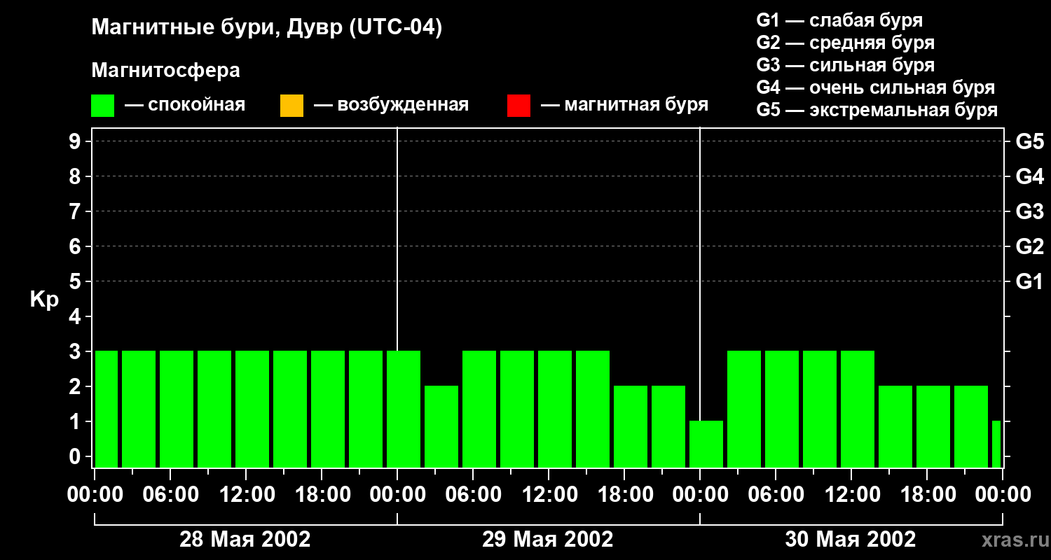 Изменения геомагнитного индекса Kp с 28 по 30 мая 2002 года для средних широт