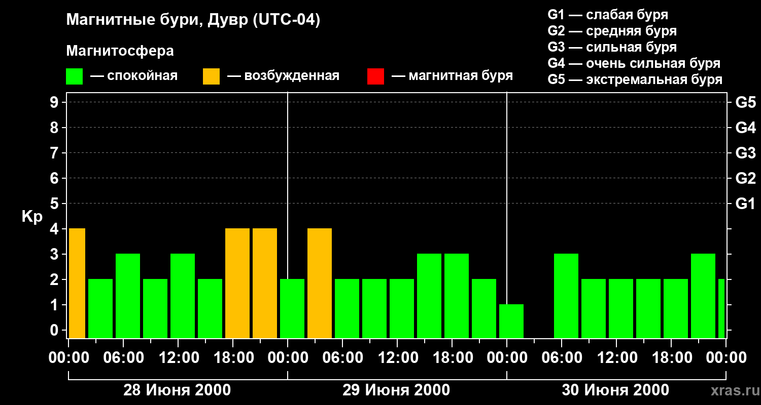 Изменения геомагнитного индекса Kp с 28 по 30 июня 2000 года для средних широт