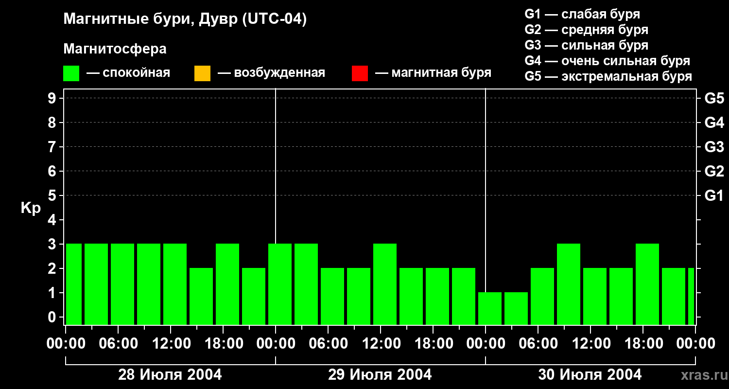 Изменения геомагнитного индекса Kp с 28 по 30 июля 2004 года для средних широт