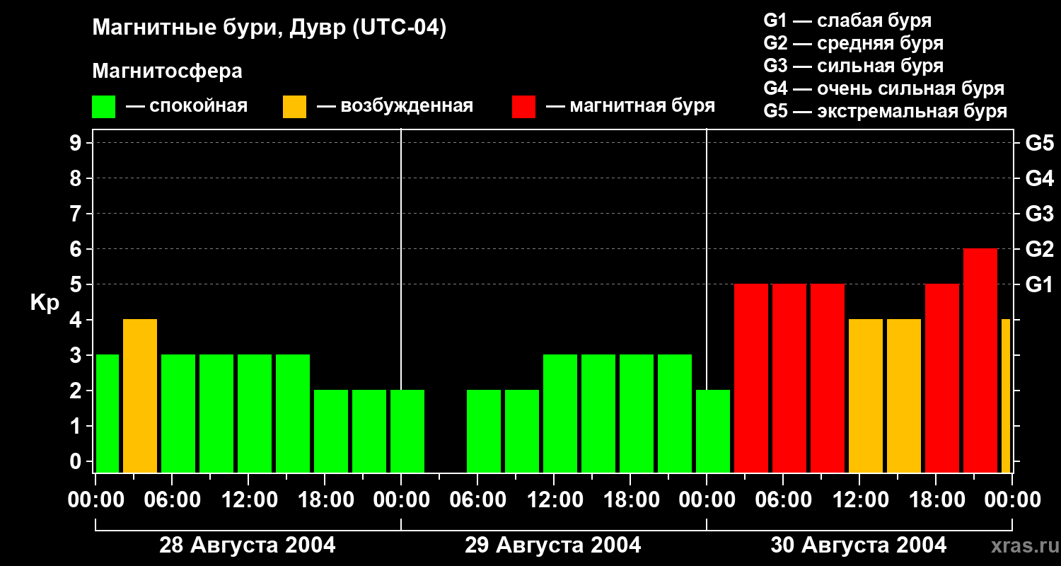 Изменения геомагнитного индекса Kp с 28 по 30 августа 2004 года для средних широт