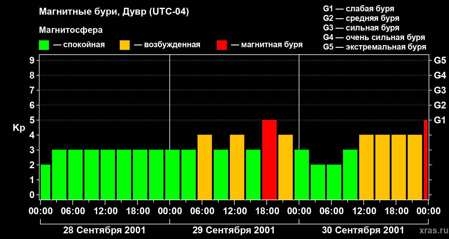 Изменения геомагнитного индекса Kp с 28 по 30 сентября 2001 года для средних широт