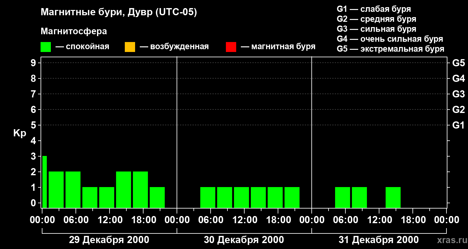 Изменения геомагнитного индекса Kp с 29 по 31 декабря 2000 года для средних широт