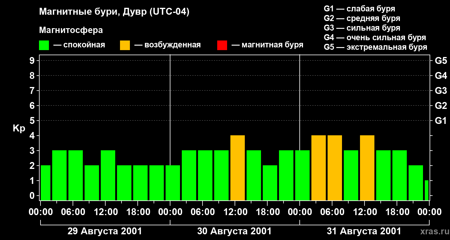 Изменения геомагнитного индекса Kp с 29 по 31 августа 2001 года для средних широт