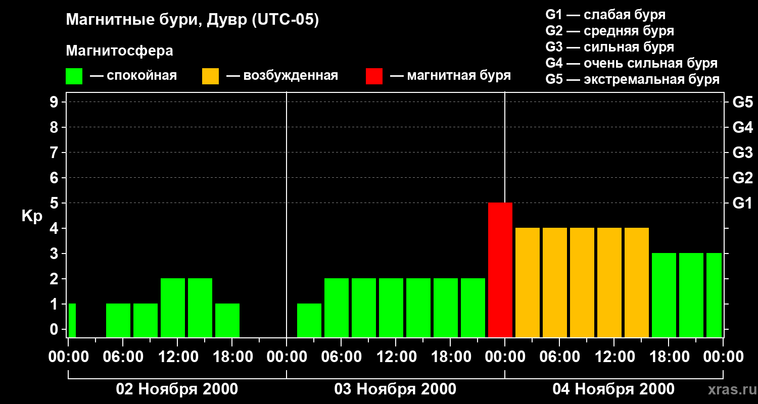 Изменения геомагнитного индекса Kp с 2 по 4 ноября 2000 года для средних широт