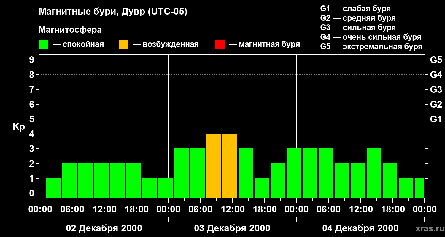 Изменения геомагнитного индекса Kp с 2 по 4 декабря 2000 года для средних широт