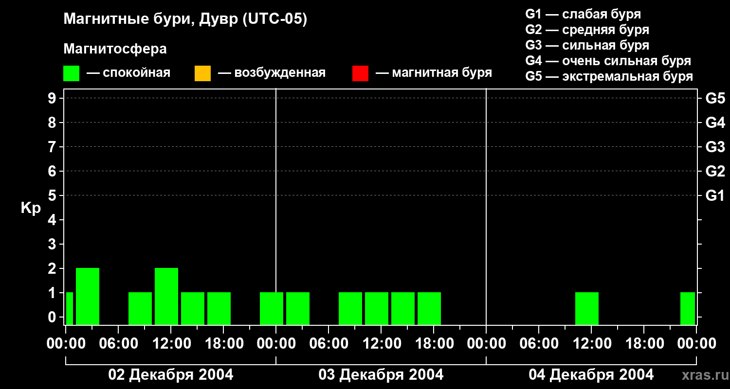 Изменения геомагнитного индекса Kp с 2 по 4 декабря 2004 года для средних широт
